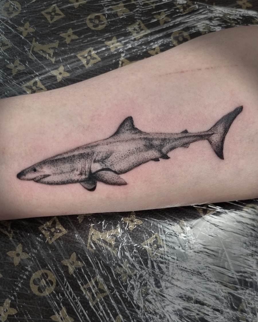 Žralok černobílý, stínovaný, dotwork